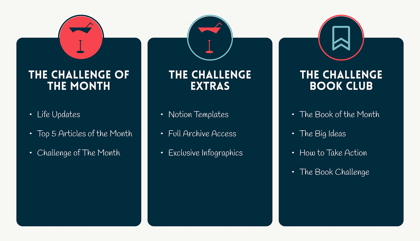 If this is the kind of thinking you want more of, paid subscribers get three things I don’t publish anywhere else: my personal column on the 1st of each month — what I’m reading, what’s happening in my life, and the 5 articles from other writers worth your time — a full book breakdown whenever I finish something worth sharing, and 10 Notion templates built around the systems I cover here. It’s $5/month.