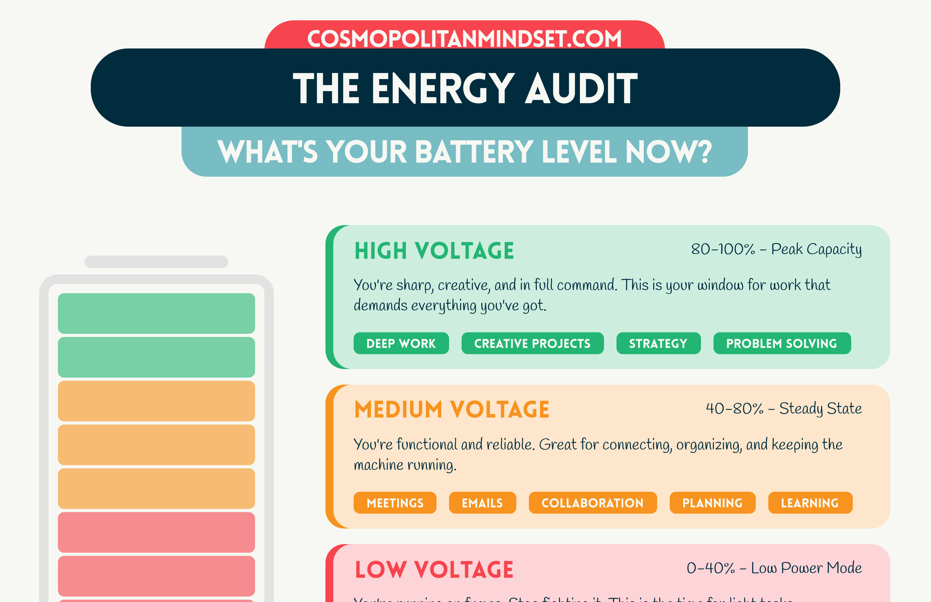High Voltage (80-100%): You’re sharp and creative. You can discern complex topics and tackle the hard stuff — strategy, creation, problem-solving, and deep work that requires your full mental capacity.